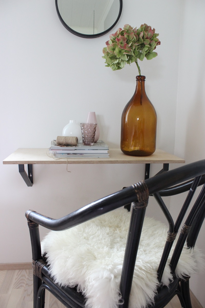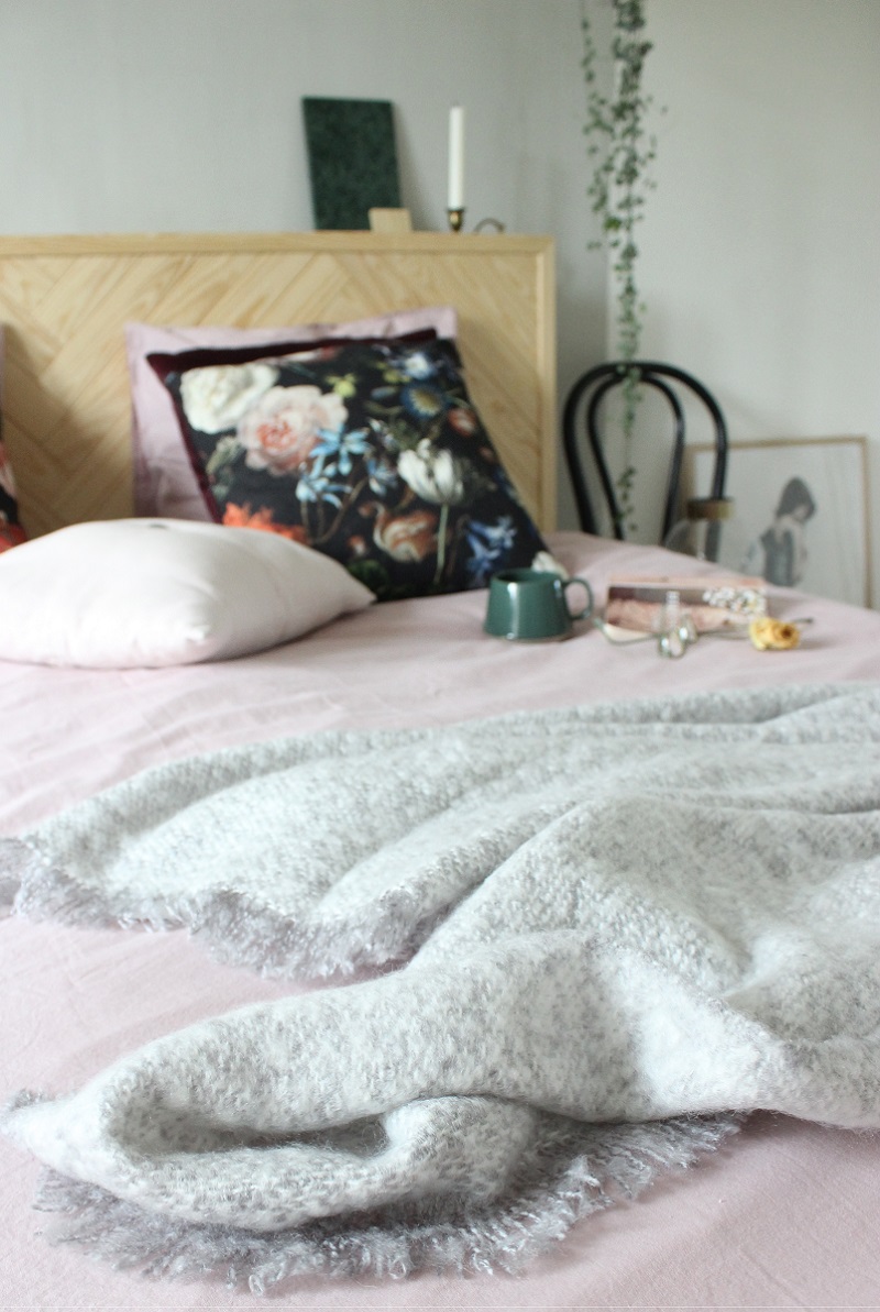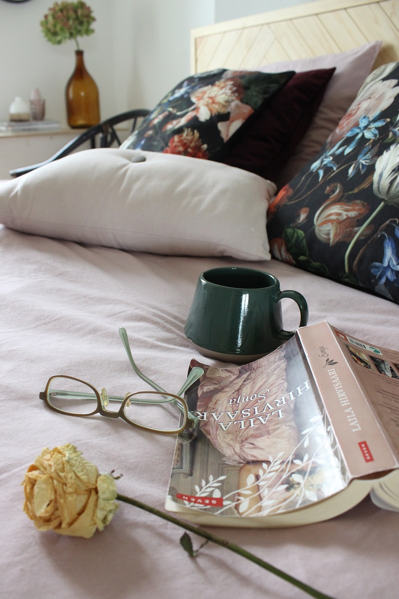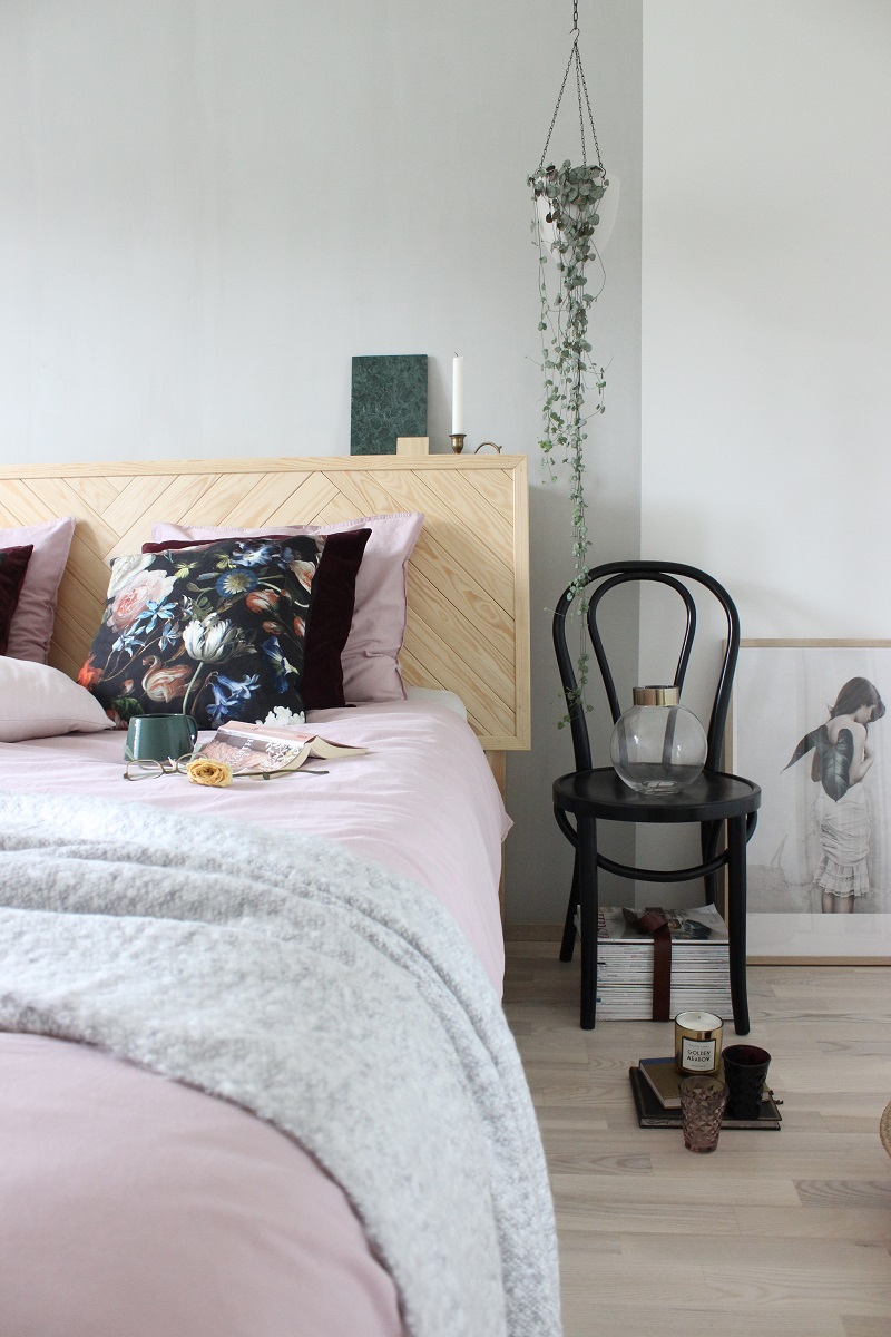 Makuuhuoneen stailaus toteutettiin yhteistyössä Kotiblogit-lehden ja H&M Homen kanssa. Stailauksessa hyödynnettiin tulevia trendejä, värisävyjä ja materiaaleja valitessa. Kuvan sängynpääty on suunnittelemani, samoin kuvien tyynyt ovat käsialaani. Lue lisää projektista blogista: