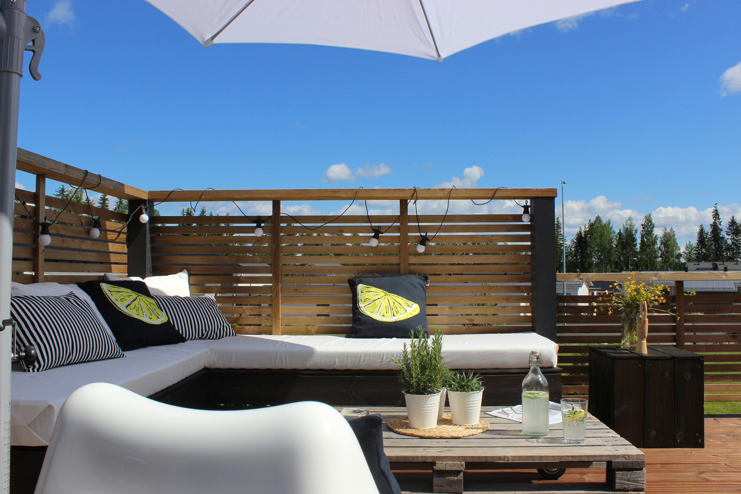 Paritalon terassin ja kalusteiden suunnittelu, sekä tekstiilien suunnittelu ja valmistus. Terassin stailaus toteutettiin blogiyhteistyössä Ateljee Keltaisen Talon kanssa.